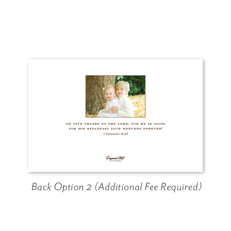 Select your order quantity from the dropdown menu below and check your total. Then click the Customize and Add to Cart button to create your card and add it to your cart.Want to add up to 4 photos on the back or inside of your card? Click here to add the fee to your cart.