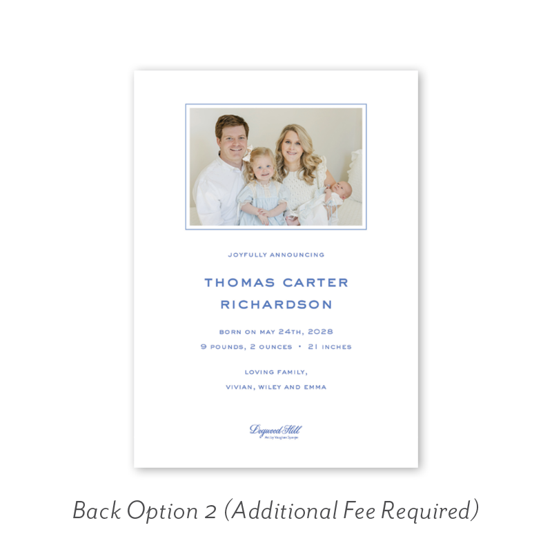 Select your order quantity from the dropdown menu below and check your total. Then click the Customize and Add to Cart button to create your card and add it to your cart.Want to add up to 4 photos on the back or inside of your card? Click here to add the fee to your cart.