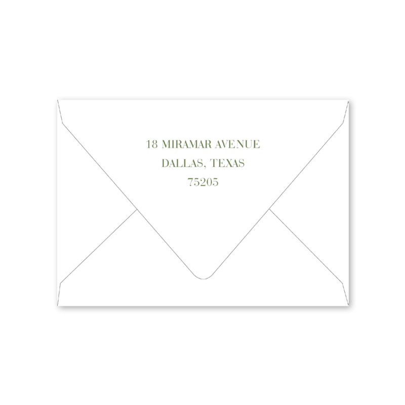 Enter your order quantity and check your total. Please enter your address EXACTLY like you want it printed on your envelope in the "Note" box below. Click Add to Cart. You will not receive a proof during the holidays (September 15 – December 31), unless your accompanying card requires a proof. If you do not include your address in the "Note" box or email it to Customer Service within 24 hours of placing your order, we will use your shipping address as the printed return address on your envelope.