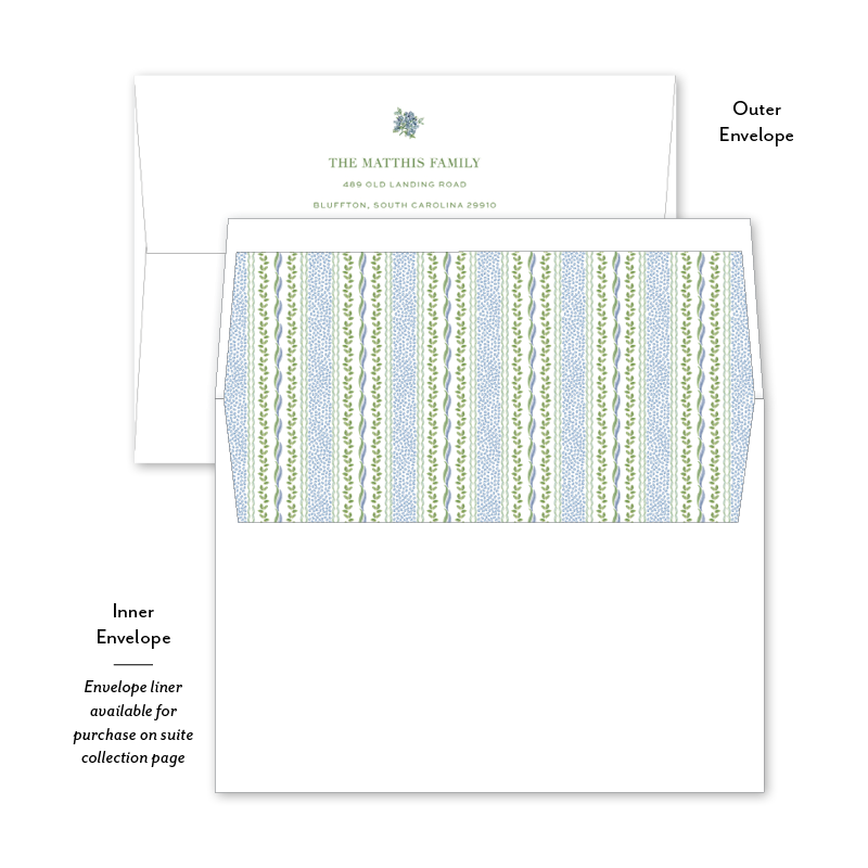 Each invitation comes with an inner and outer envelope and return address printing on the outer envelope flap. Envelope liner may be purchased for an additional cost on the main collection page.