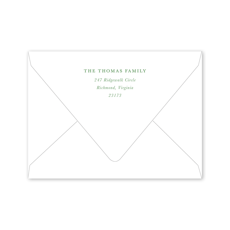 Enter your order quantity and check your total. Please enter your address EXACTLY like you want it printed on your envelope in the "Note" box below. Click Add to Cart. You will not receive a proof during the holidays (September 15 – December 31), unless your accompanying card requires a proof. If you do not include your address in the "Note" box or email it to Customer Service within 24 hours of placing your order, we will use your shipping address as the printed return address on your envelope.