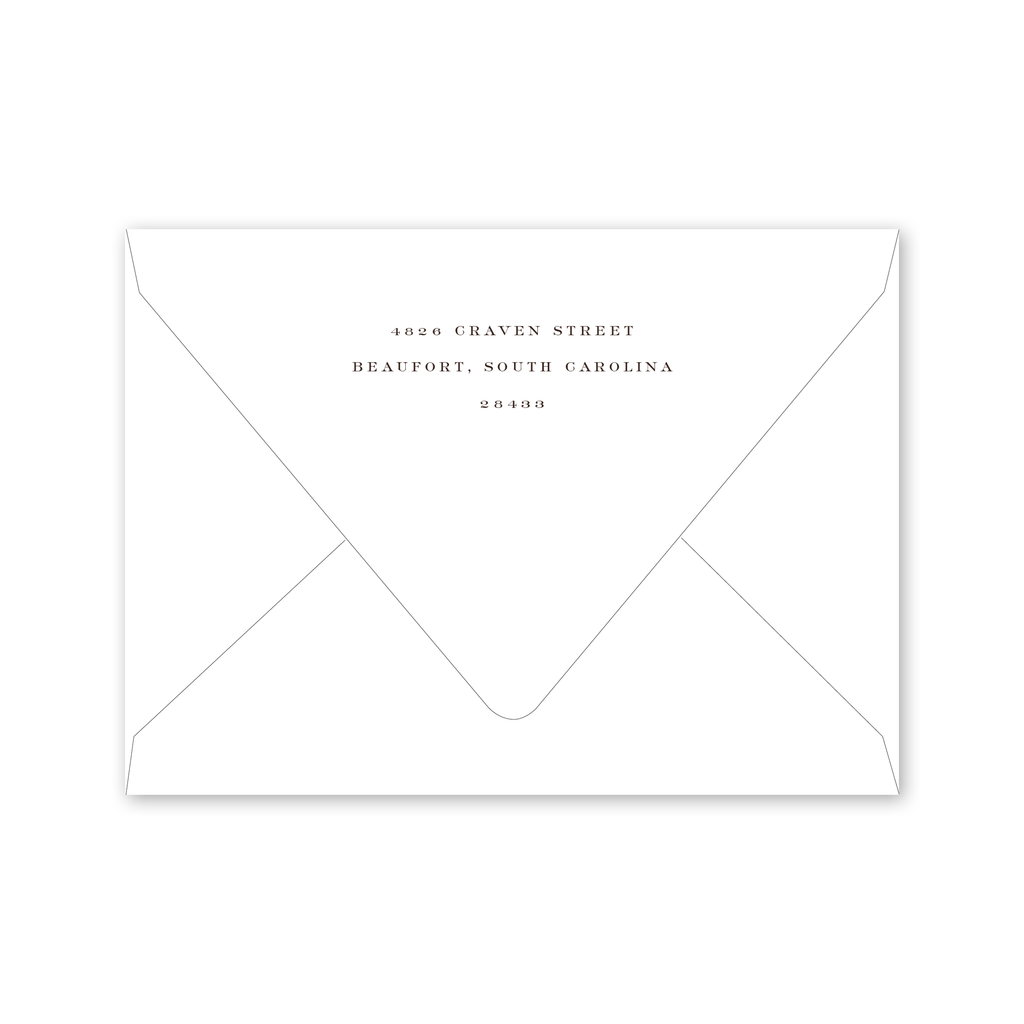 Enter your order quantity and check your total. Please enter your address EXACTLY like you want it printed on your envelope in the "Note" box below. Click Add to Cart. You will not receive a proof during the holidays (September 15 – December 31), unless your accompanying card requires a proof. If you do not include your address in the "Note" box or email it to Customer Service within 24 hours of placing your order, we will use your shipping address as the printed return address on your envelope.