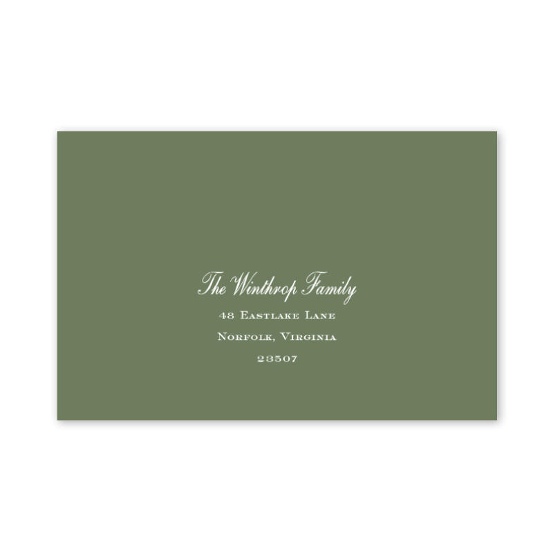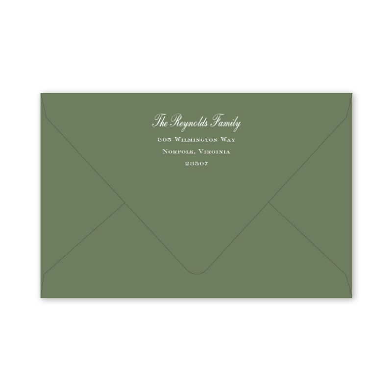 Enter your order quantity and check your total. Please enter your address EXACTLY like you want it printed on your envelope in the "Note" box below. Click Add to Cart. You will not receive a proof during the holidays (September 15 – December 31), unless your accompanying card requires a proof. If you do not include your address in the "Note" box or email it to Customer Service within 24 hours of placing your order, we will use your shipping address as the printed return address on your envelope. Enter your order quantity and check your total. Then click the Customize and Add to Cart button to enter your address and add the envelope to your cart. | /