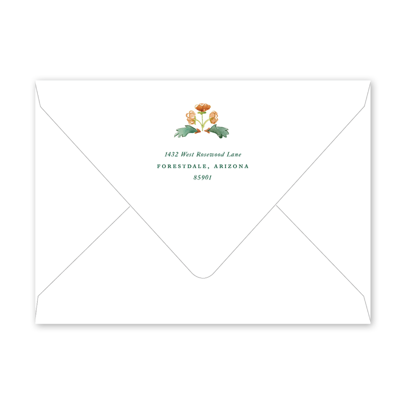 Enter your order quantity and check your total. Please enter your address EXACTLY like you want it printed on your envelope in the "Note" box below. Click Add to Cart. You will not receive a proof during the holidays (September 15 – December 31), unless your accompanying card requires a proof. If you do not include your address in the "Note" box or email it to Customer Service within 24 hours of placing your order, we will use your shipping address as the printed return address on your envelope. Enter your order quantity and check your total. Then click the Customize and Add to Cart button to enter your address and add the envelope to your cart.