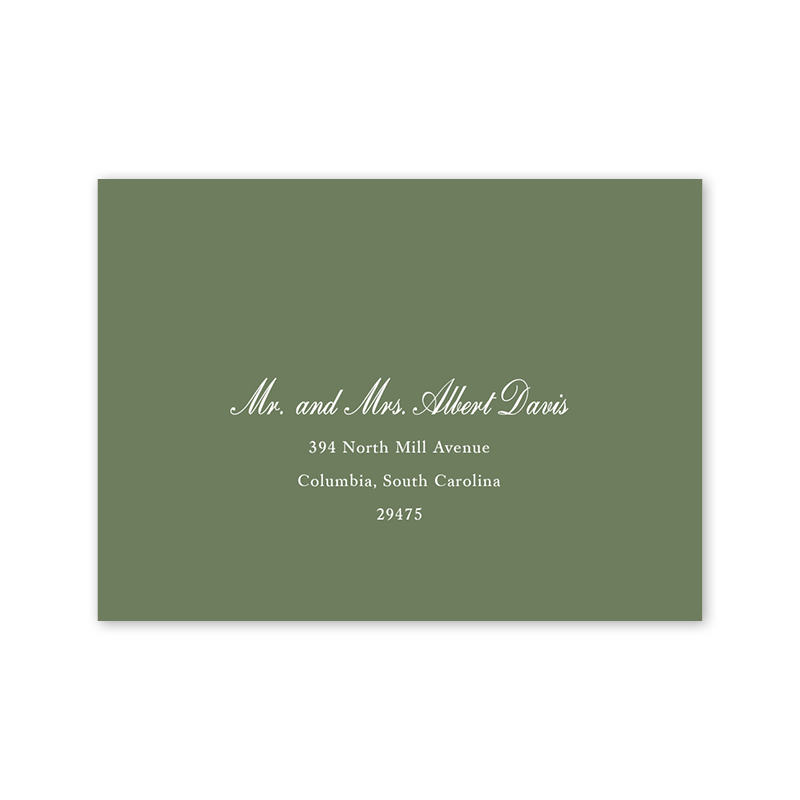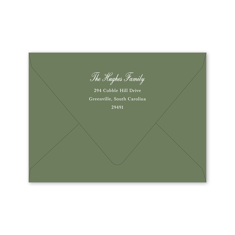 Enter your order quantity and check your total. Please enter your address EXACTLY like you want it printed on your envelope in the "Note" box below. Click Add to Cart. You will not receive a proof during the holidays (September 15 – December 31), unless your accompanying card requires a proof. If you do not include your address in the "Note" box or email it to Customer Service within 24 hours of placing your order, we will use your shipping address as the printed return address on your envelope. | /