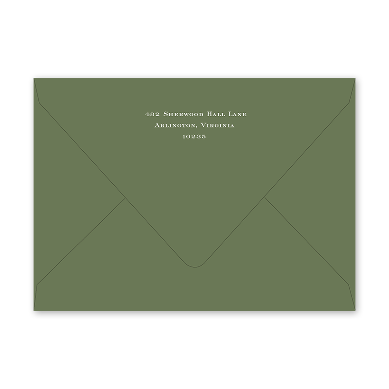 Enter your order quantity and check your total. Please enter your address EXACTLY like you want it printed on your envelope in the "Note" box below. Click Add to Cart. You will not receive a proof during the holidays (September 15 – December 31), unless your accompanying card requires a proof. If you do not include your address in the "Note" box or email it to Customer Service within 24 hours of placing your order, we will use your shipping address as the printed return address on your envelope. Enter your order quantity and check your total. Then click the Customize and Add to Cart button to enter your address and add the envelope to your cart. | /