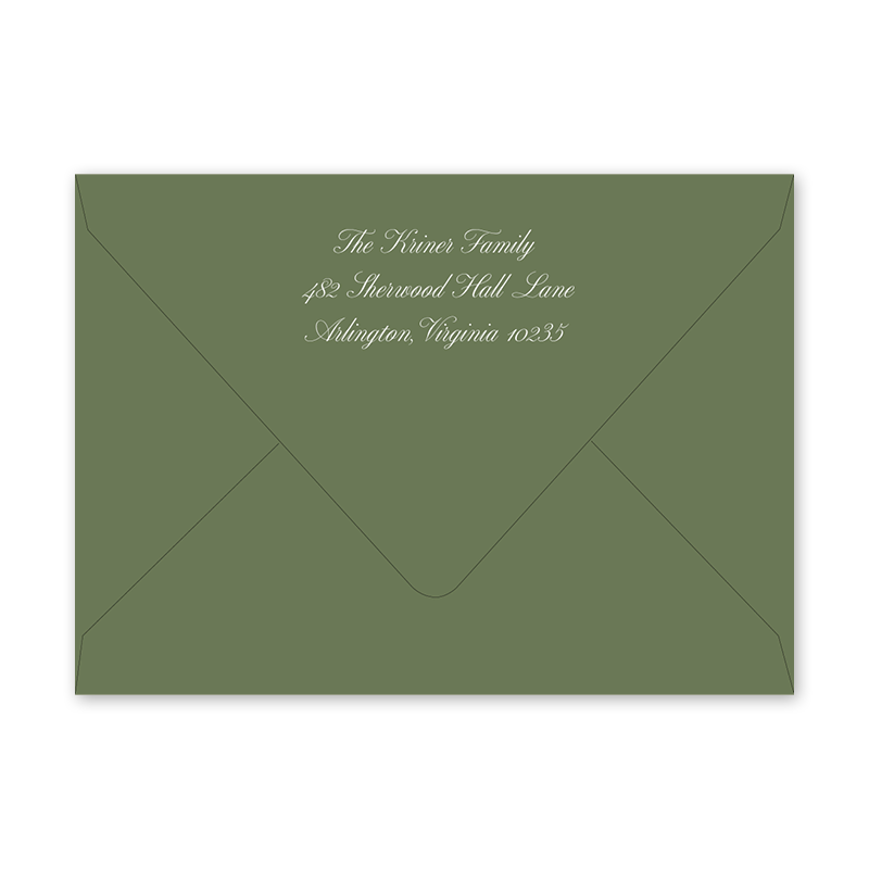 Enter your order quantity and check your total. Please enter your address EXACTLY like you want it printed on your envelope in the "Note" box below. Click Add to Cart. You will not receive a proof during the holidays (September 15 – December 31), unless your accompanying card requires a proof. If you do not include your address in the "Note" box or email it to Customer Service within 24 hours of placing your order, we will use your shipping address as the printed return address on your envelope. Enter your order quantity and check your total. Then click the Customize and Add to Cart button to enter your address and add the envelope to your cart.