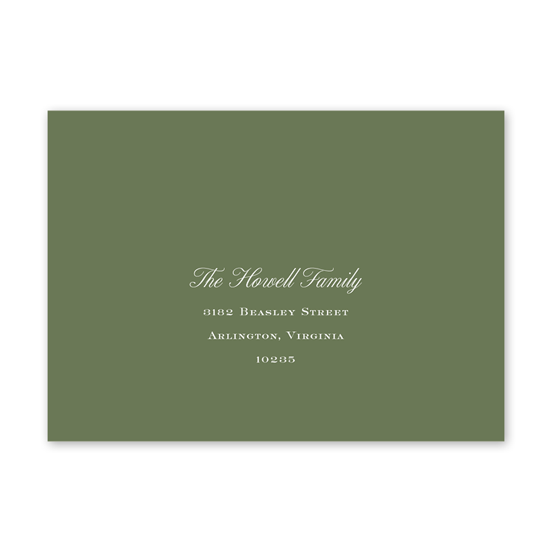Enter your order quantity and check your total. Please enter your address EXACTLY like you want it printed on your envelope in the "Note" box below. Click Add to Cart. You will not receive a proof during the holidays (September 15 – December 31), unless your accompanying card requires a proof. If you do not include your address in the "Note" box or email it to Customer Service within 24 hours of placing your order, we will use your shipping address as the printed return address on your envelope. Enter your order quantity and check your total. Then click the Customize and Add to Cart button to enter your address and add the envelope to your cart. | /