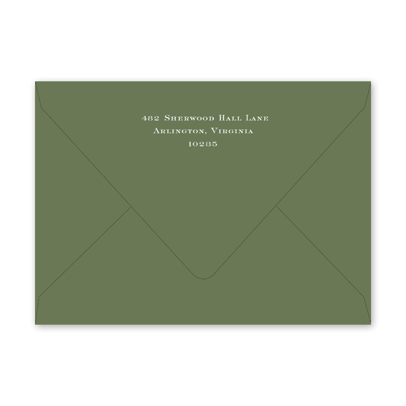 Enter your order quantity and check your total. Please enter your address EXACTLY like you want it printed on your envelope in the "Note" box below. Click Add to Cart. You will not receive a proof during the holidays (September 15 – December 31), unless your accompanying card requires a proof. If you do not include your address in the "Note" box or email it to Customer Service within 24 hours of placing your order, we will use your shipping address as the printed return address on your envelope. Enter your order quantity and check your total. Then click the Customize and Add to Cart button to enter your address and add the envelope to your cart. | /