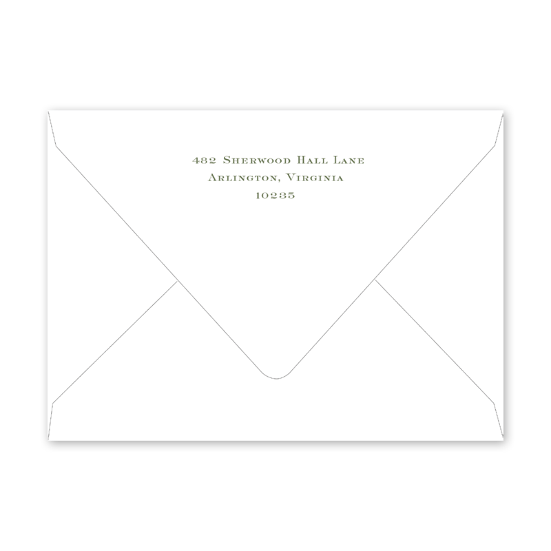 Enter your order quantity and check your total. Please enter your address EXACTLY like you want it printed on your envelope in the "Note" box below. Click Add to Cart. You will not receive a proof during the holidays (September 15 – December 31), unless your accompanying card requires a proof. If you do not include your address in the "Note" box or email it to Customer Service within 24 hours of placing your order, we will use your shipping address as the printed return address on your envelope.