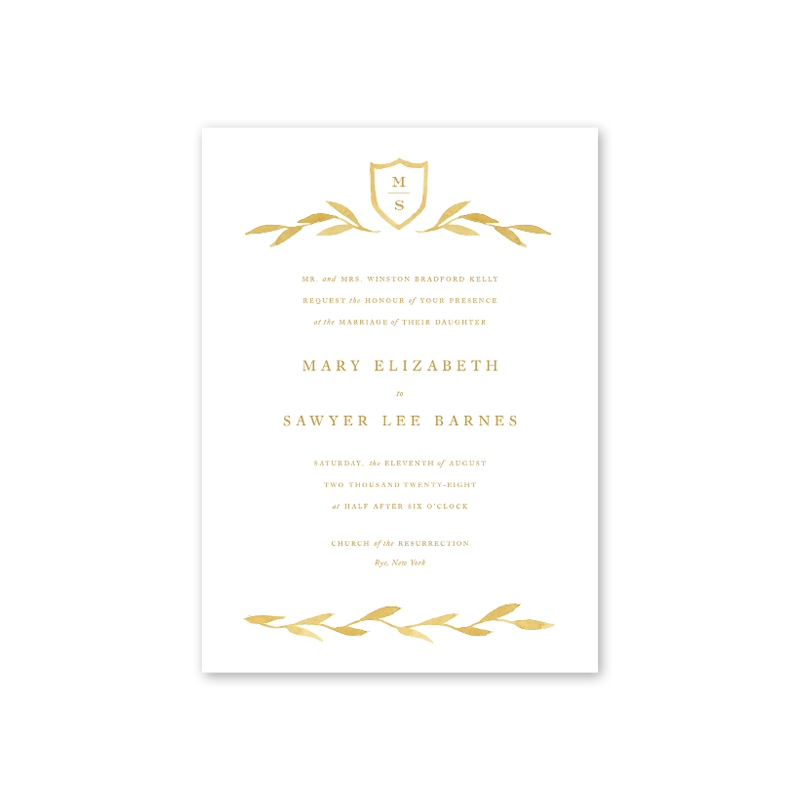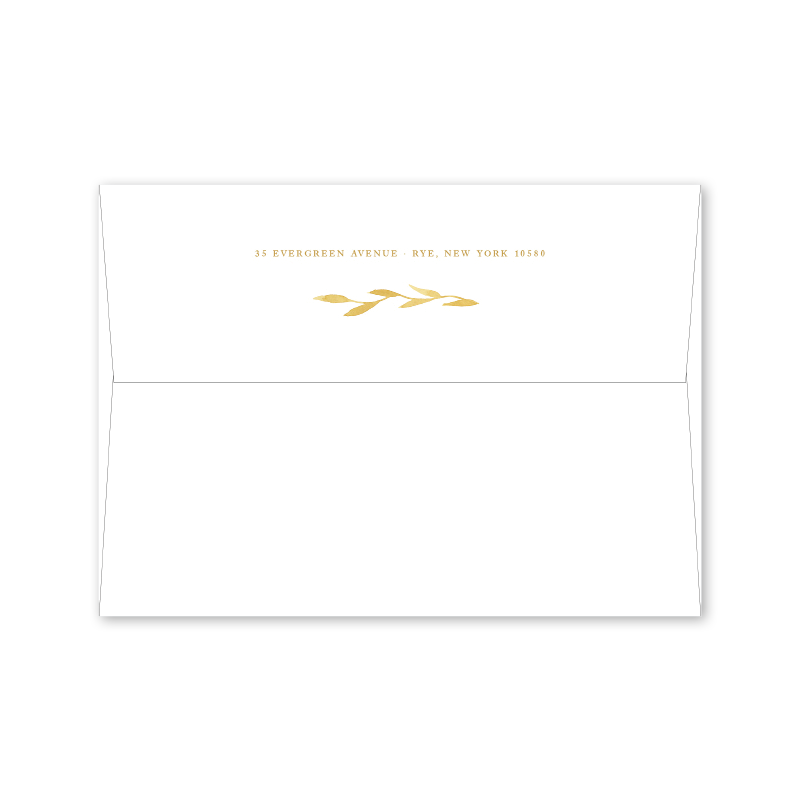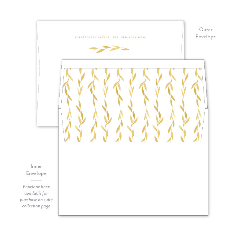 Each invitation comes with a blank inner and outer envelope and return address printing on the outer envelope flap. Envelope liner and recipient address printing for each envelope may be purchased for an additional cost on the main collection page.