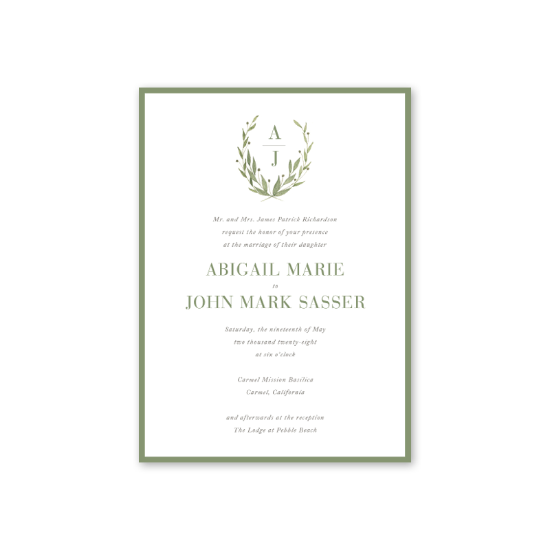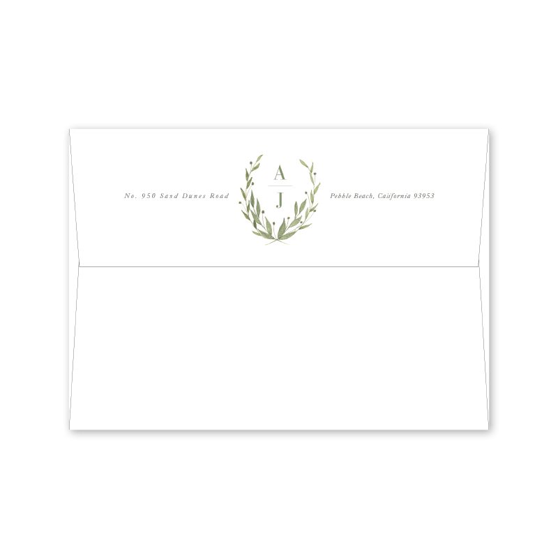 Each invitation comes with a blank inner and outer envelope and return address printing on the outer envelope flap. Envelope liner and recipient address printing for each envelope may be purchased for an additional cost on the main collection page.