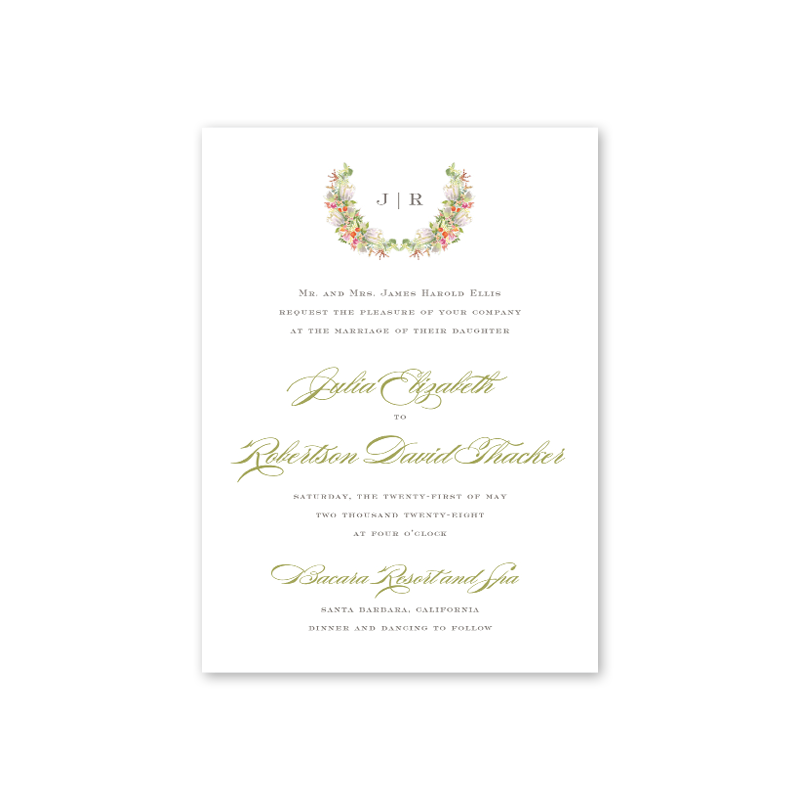 Each invitation comes with a blank inner and outer envelope and return address printing on the outer envelope flap. Envelope liner and recipient address printing for each envelope may be purchased for an additional cost on the main collection page.