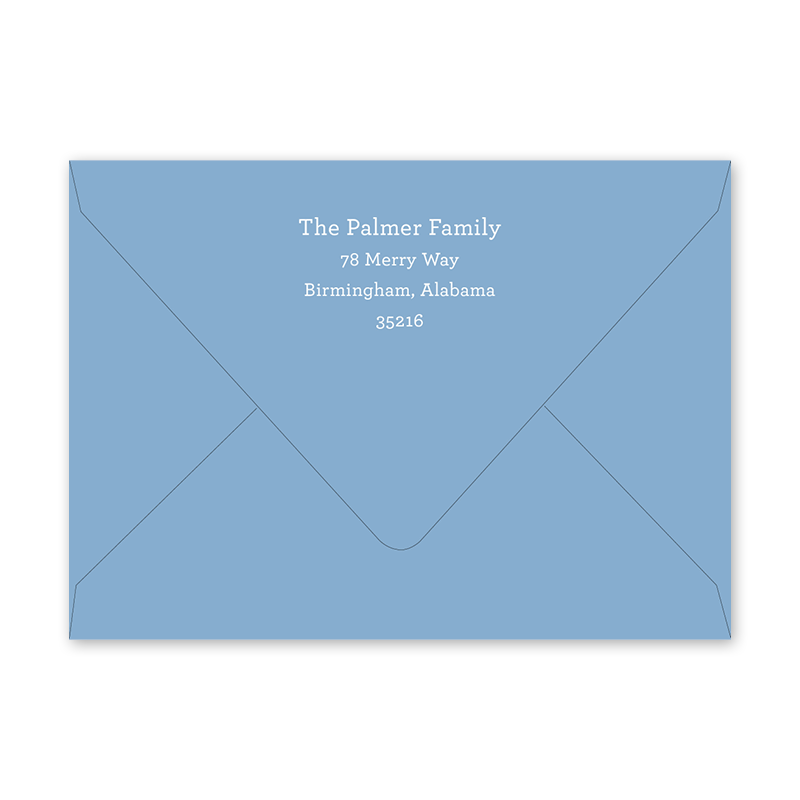 Enter your order quantity and check your total. Please enter your address EXACTLY like you want it printed on your envelope in the "Note" box below. Click Add to Cart. You will not receive a proof during the holidays (September 15 – December 31), unless your accompanying card requires a proof. If you do not include your address in the "Note" box or email it to Customer Service within 24 hours of placing your order, we will use your shipping address as the printed return address on your envelope. Enter your order quantity and check your total. Then click the Customize and Add to Cart button to enter your address and add the envelope to your cart. | /