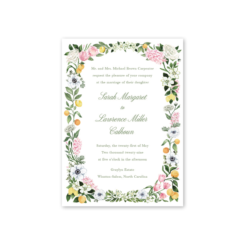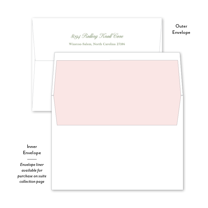 Each invitation comes with a blank inner and outer envelope and return address printing on the outer envelope flap. Envelope liner and recipient address printing for each envelope may be purchased for an additional cost on the main collection page.