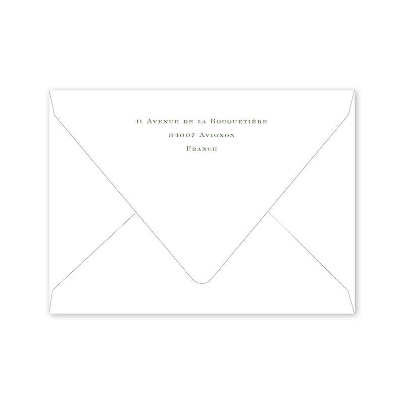 Enter your order quantity and check your total. Please enter your address EXACTLY like you want it printed on your envelope in the "Note" box below. Click Add to Cart. You will not receive a proof during the holidays (September 15 – December 31), unless your accompanying card requires a proof. If you do not include your address in the "Note" box or email it to Customer Service within 24 hours of placing your order, we will use your shipping address as the printed return address on your envelope.