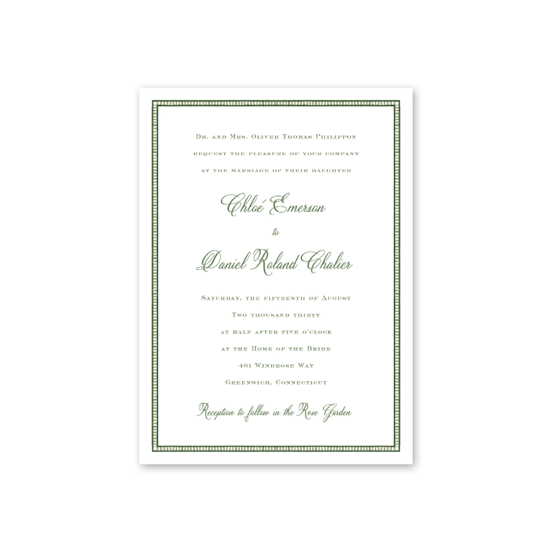 Each invitation comes with a blank inner and outer envelope and return address printing on the outer envelope flap.  Envelope liner and recipient address printing for each envelope may be purchased for an additional cost on the main collection page.