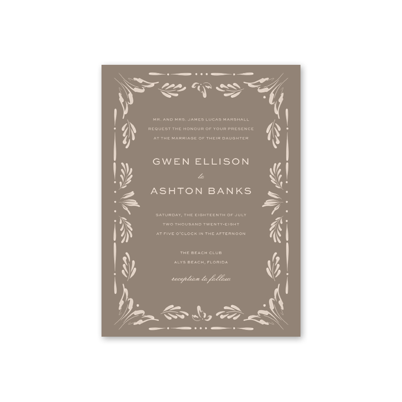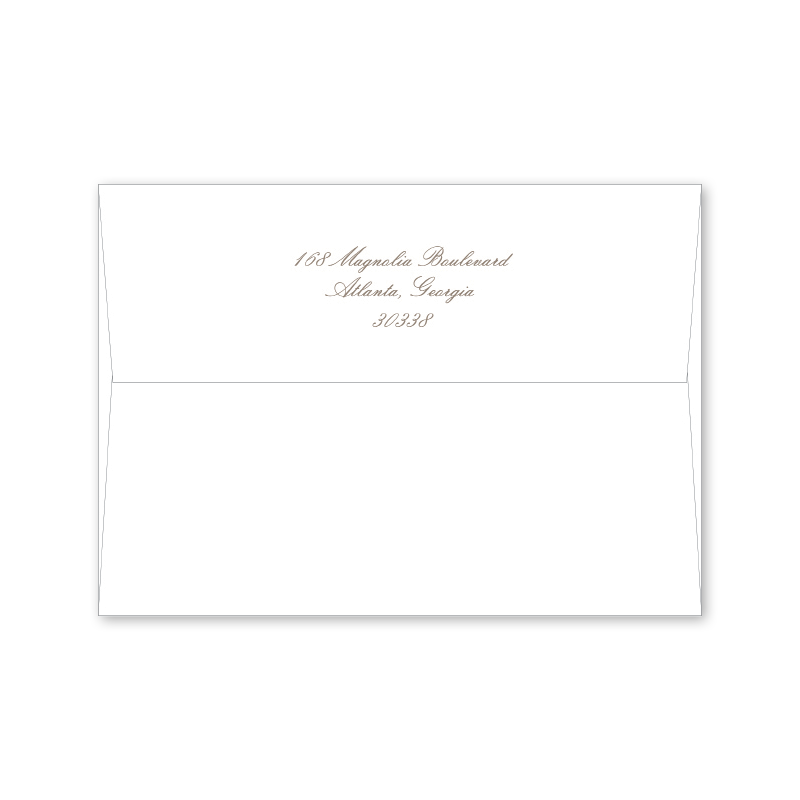Each invitation comes with a blank inner and outer envelope and return address printing on the outer envelope flap. Envelope liner and recipient address printing for each envelope may be purchased for an additional cost on the main collection page.