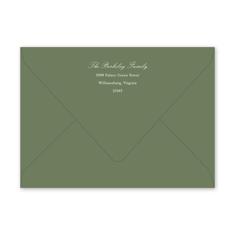 Enter your order quantity and check your total. Please enter your address EXACTLY like you want it printed on your envelope in the "Note" box below. Click Add to Cart. You will not receive a proof during the holidays (September 15 – December 31), unless your accompanying card requires a proof. If you do not include your address in the "Note" box or email it to Customer Service within 24 hours of placing your order, we will use your shipping address as the printed return address on your envelope. | /