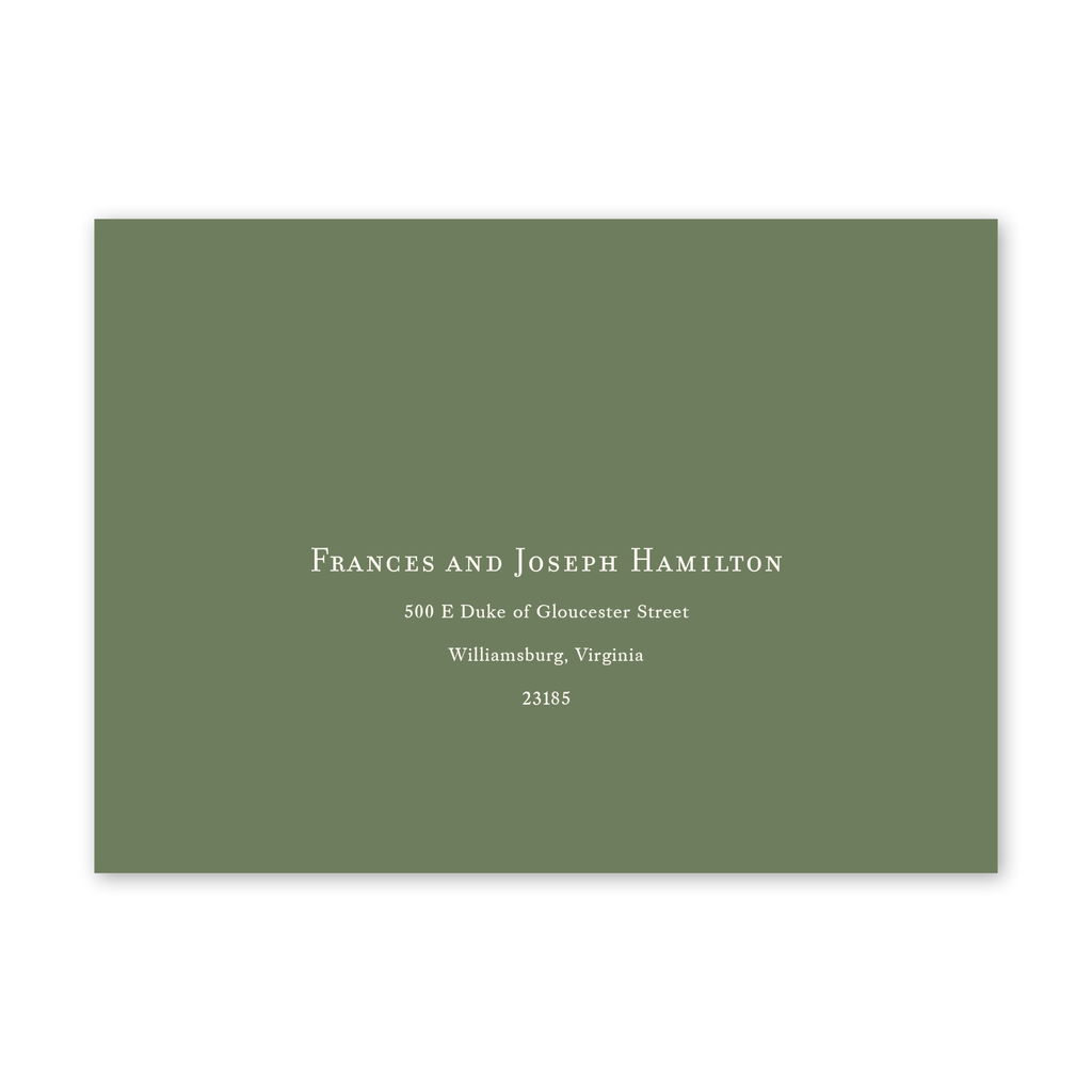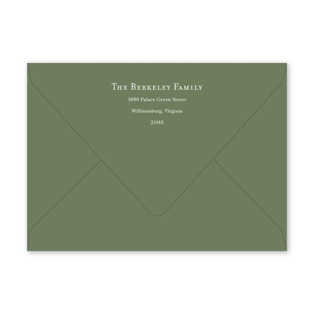Enter your order quantity and check your total. Please enter your address EXACTLY like you want it printed on your envelope in the "Note" box below. Click Add to Cart. You will not receive a proof during the holidays (September 15 – December 31), unless your accompanying card requires a proof. If you do not include your address in the "Note" box or email it to Customer Service within 24 hours of placing your order, we will use your shipping address as the printed return address on your envelope. | /