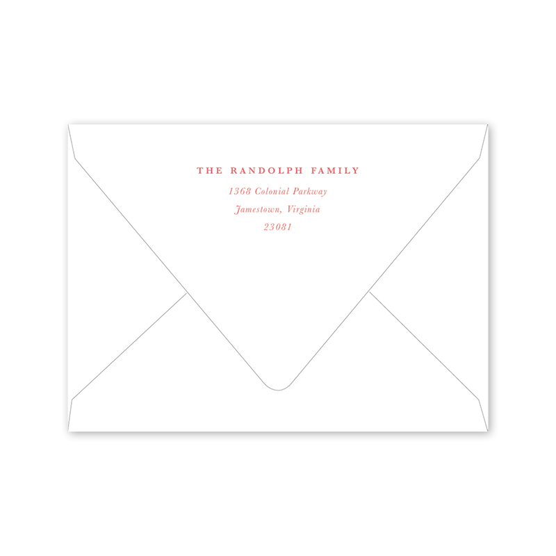 Enter your order quantity and check your total. Please enter your address EXACTLY like you want it printed on your envelope in the "Note" box below. Click Add to Cart. You will not receive a proof during the holidays (September 15 – December 31), unless your accompanying card requires a proof. If you do not include your address in the "Note" box or email it to Customer Service within 24 hours of placing your order, we will use your shipping address as the printed return address on your envelope.
