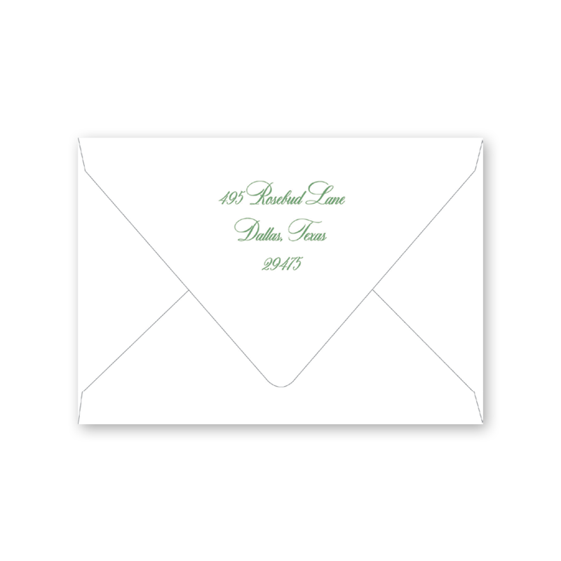 Enter your order quantity and check your total. Please enter your address EXACTLY like you want it printed on your envelope in the "Note" box below. Click Add to Cart. You will not receive a proof during the holidays (September 15 – December 31), unless your accompanying card requires a proof. If you do not include your address in the "Note" box or email it to Customer Service within 24 hours of placing your order, we will use your shipping address as the printed return address on your envelope.