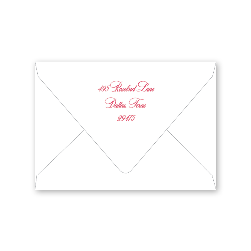 Enter your order quantity and check your total. Please enter your address EXACTLY like you want it printed on your envelope in the "Note" box below. Click Add to Cart. You will not receive a proof during the holidays (September 15 – December 31), unless your accompanying card requires a proof. If you do not include your address in the "Note" box or email it to Customer Service within 24 hours of placing your order, we will use your shipping address as the printed return address on your envelope.