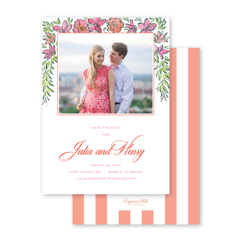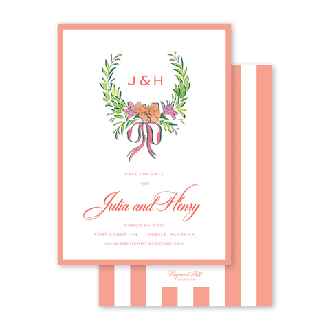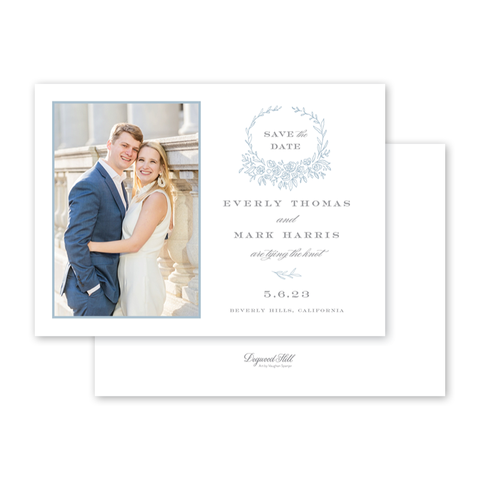 Select your order quantity from the dropdown menu below and check your total. Enter the text for your Save the Date in the “Note” box below. Click Add to Cart. Your wording does not have to match the sample product wording and can be customized for your Save the Date. You will receive a proof notification via email and text message within 3 to 5 business days.If your Save the Date includes a photo, please email a high resolution image along with your order number to weddings@dogwood-hill.com.