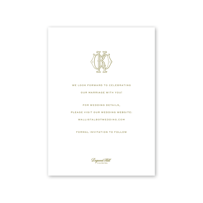 Select your order quantity from the dropdown menu below and check your total. Enter the text for your Save the Date in the “Note” box below. Click Add to Cart. Your wording does not have to match the sample product wording and can be customized for your Save the Date. You will receive a proof notification via email and text message within 3 to 5 business days.If your Save the Date includes a photo, please email a high resolution image along with your order number to weddings@dogwood-hill.com.