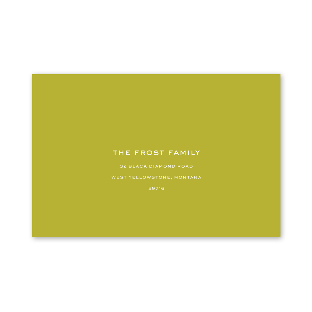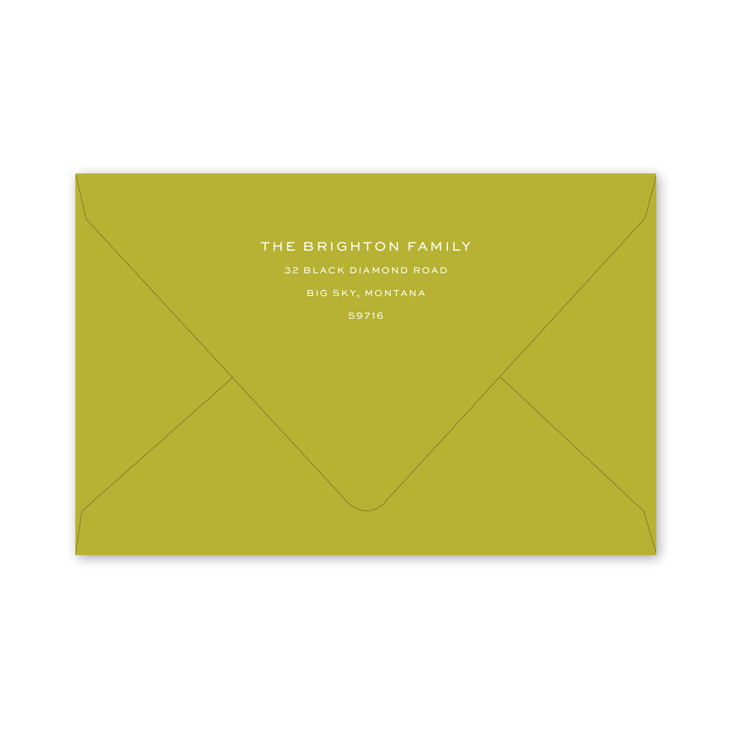 Enter your order quantity and check your total. Please enter your address EXACTLY like you want it printed on your envelope in the "Note" box below. Click Add to Cart. You will not receive a proof during the holidays (September 15 – December 31), unless your accompanying card requires a proof. If you do not include your address in the "Note" box or email it to Customer Service within 24 hours of placing your order, we will use your shipping address as the printed return address on your envelope. | /