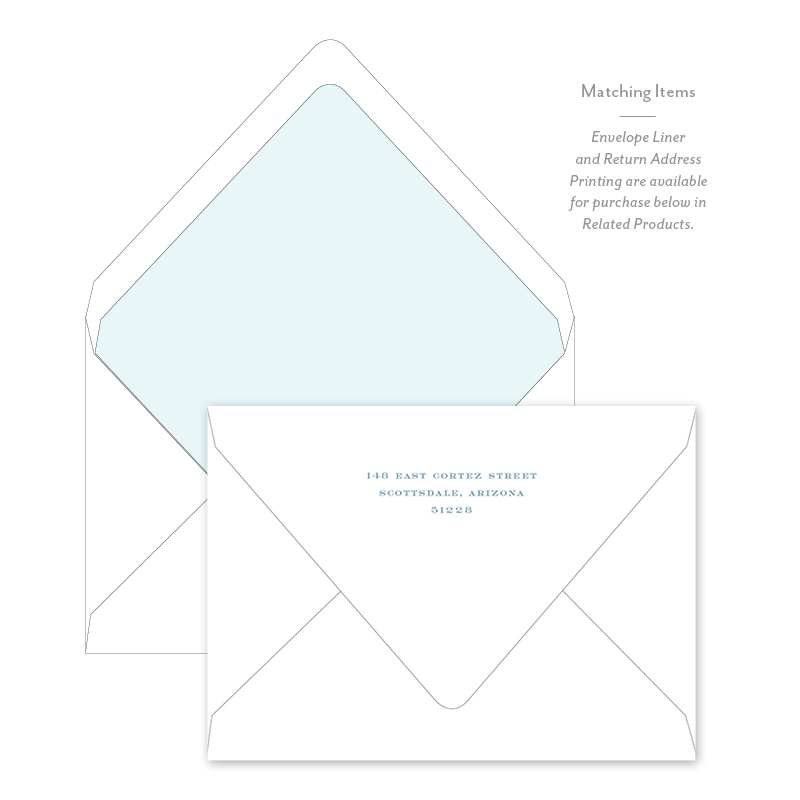 Select your order quantity from the dropbox menu below and check your total. Enter the personalization text for your notecard in the “Note” box below. Click Add to Cart. You will receive a proof notification via email and text message within 3 to 5 business days.Each card comes with one free BLANK Eggshell White envelope.