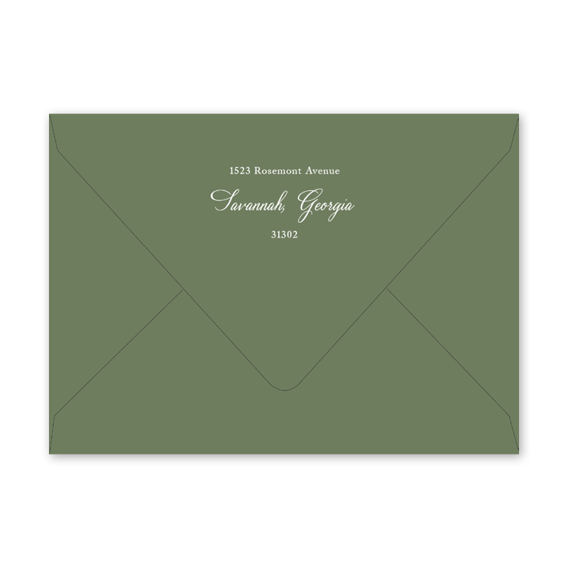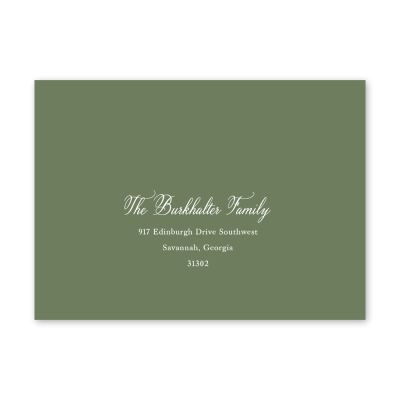 Enter your order quantity and check your total. Please enter your address EXACTLY like you want it printed on your envelope in the "Note" box below. Click Add to Cart. You will not receive a proof during the holidays (September 15 – December 31), unless your accompanying card requires a proof. If you do not include your address in the "Note" box or email it to Customer Service within 24 hours of placing your order, we will use your shipping address as the printed return address on your envelope. | /