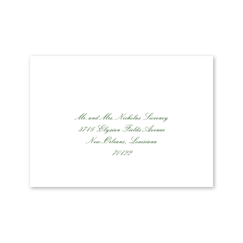 Each invitation comes with a blank inner and outer envelope and return address printing on the outer envelope flap. Envelope liner and recipient address printing for each envelope may be purchased for an additional cost on the main collection page.