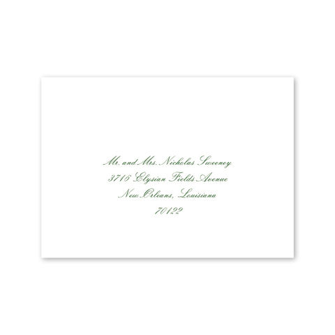 Each invitation comes with a blank inner and outer envelope and return address printing on the outer envelope flap. Envelope liner and recipient address printing for each envelope may be purchased for an additional cost on the main collection page.