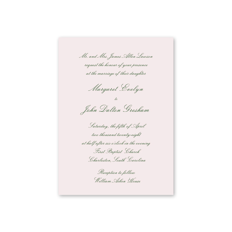 Each invitation comes with a blank inner and outer envelope and return address printing on the outer envelope flap. Envelope liner and recipient address printing for each envelope may be purchased for an additional cost on the main collection page.
