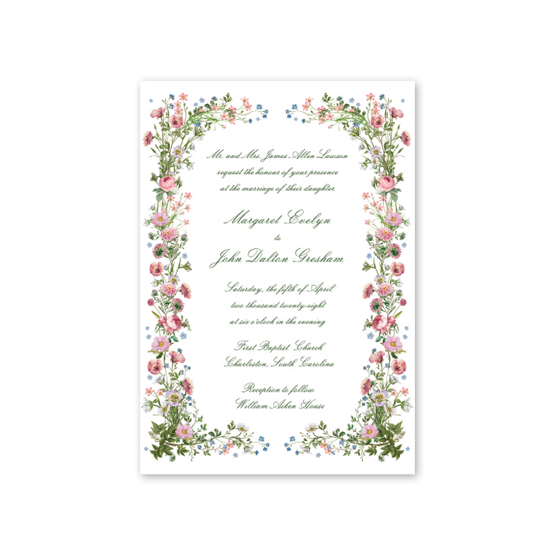 Each invitation comes with a blank inner and outer envelope and return address printing on the outer envelope flap. Envelope liner and recipient address printing for each envelope may be purchased for an additional cost on the main collection page.