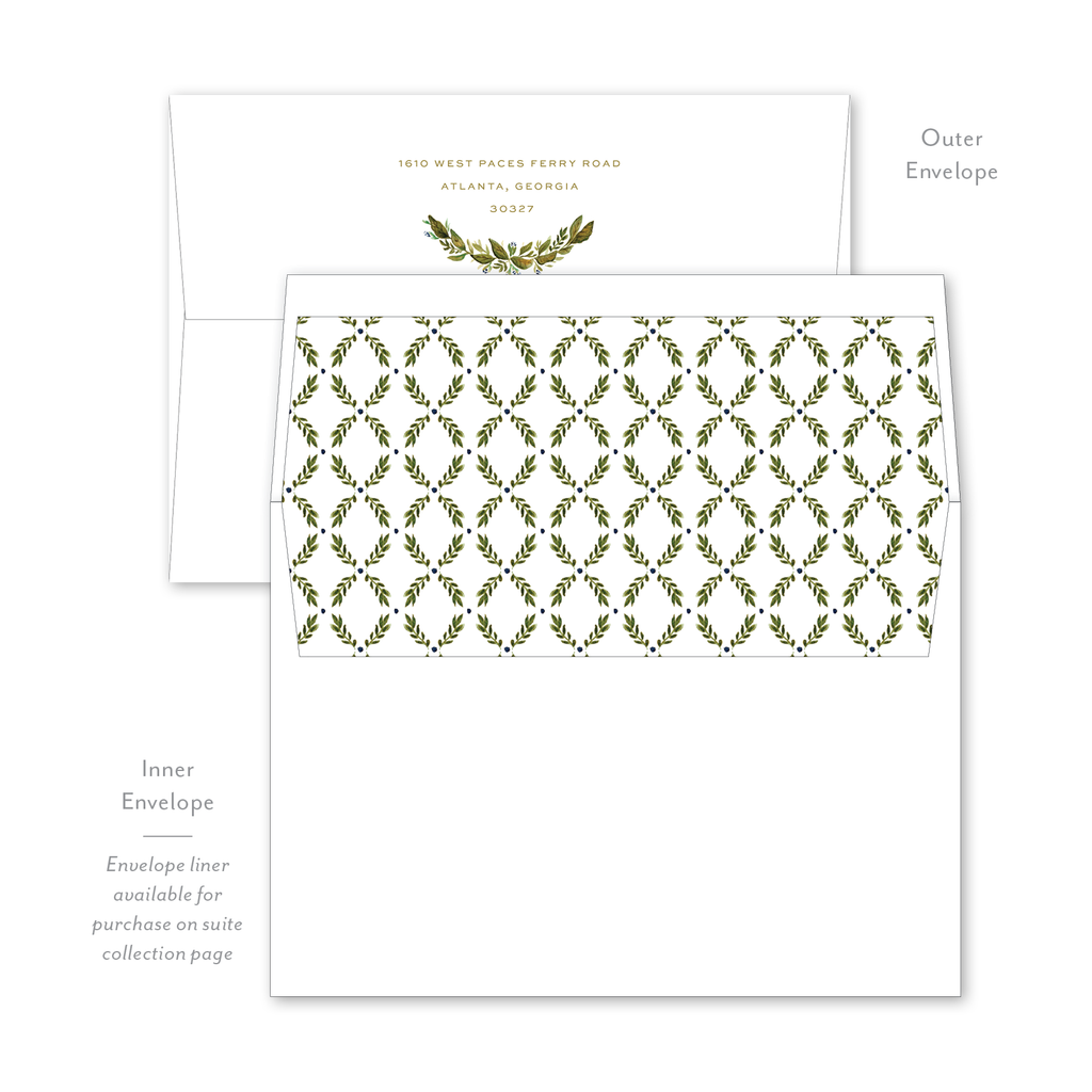 Each invitation comes with an inner and outer envelope and return address printing on the outer envelope flap. Envelope liner may be purchased for an additional cost on the main collection page.