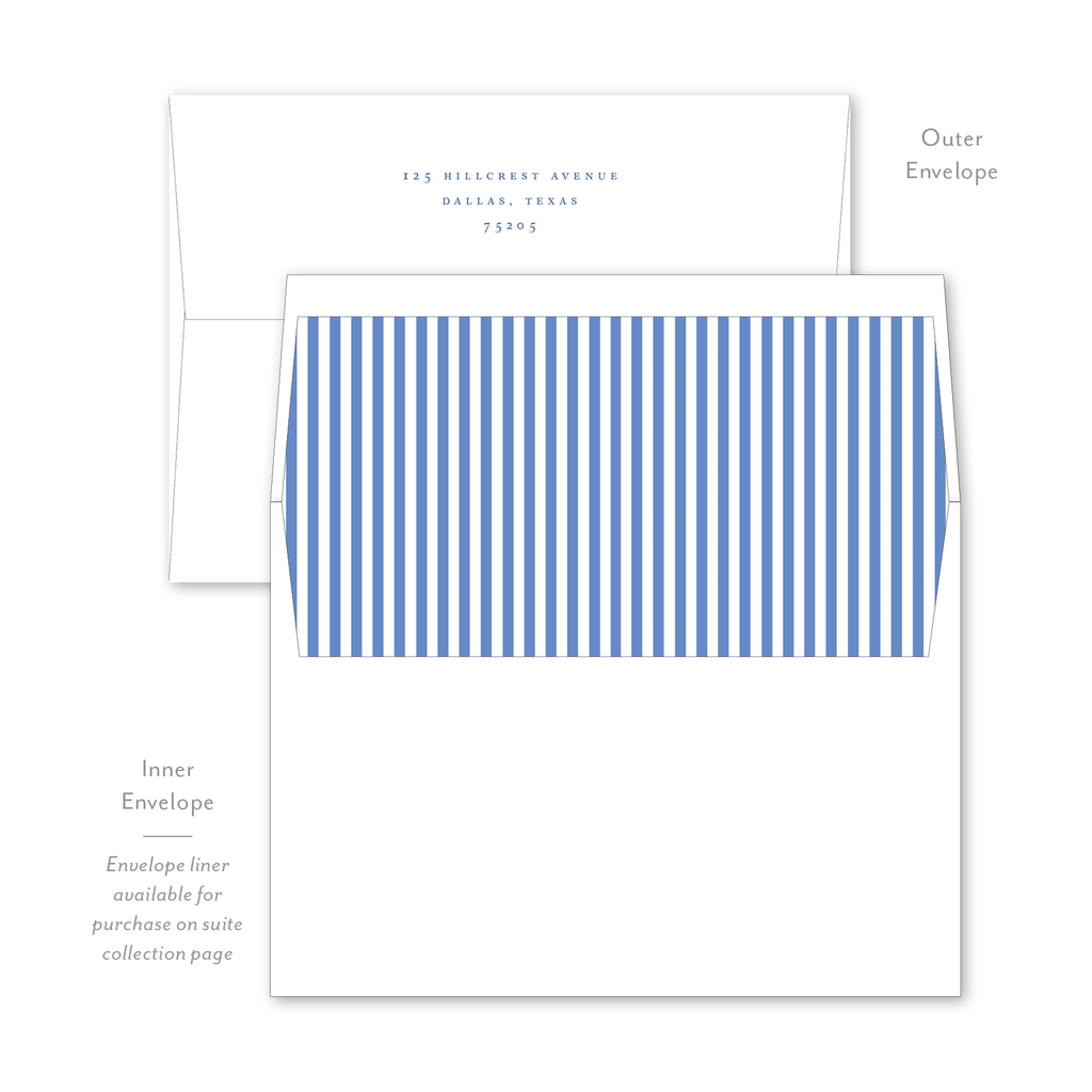 Each invitation comes with an inner and outer envelope and return address printing on the outer envelope flap. Envelope liner may be purchased for an additional cost on the main collection page.