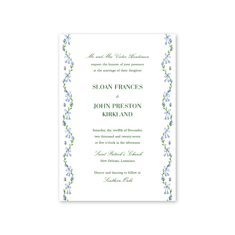 Each invitation comes with a blank inner and outer envelope and return address printing on the outer envelope flap. Envelope liner and recipient address printing for each envelope may be purchased for an additional cost on the main collection page.