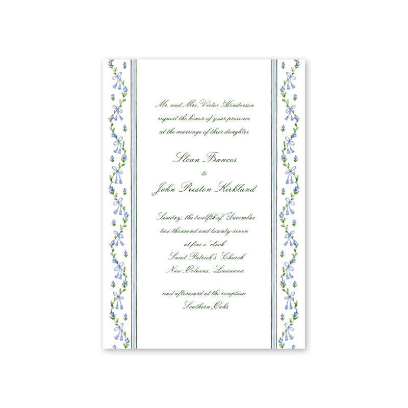 Each invitation comes with a blank inner and outer envelope and return address printing on the outer envelope flap.  Envelope liner and recipient address printing for each envelope may be purchased for an additional cost on the main collection page.