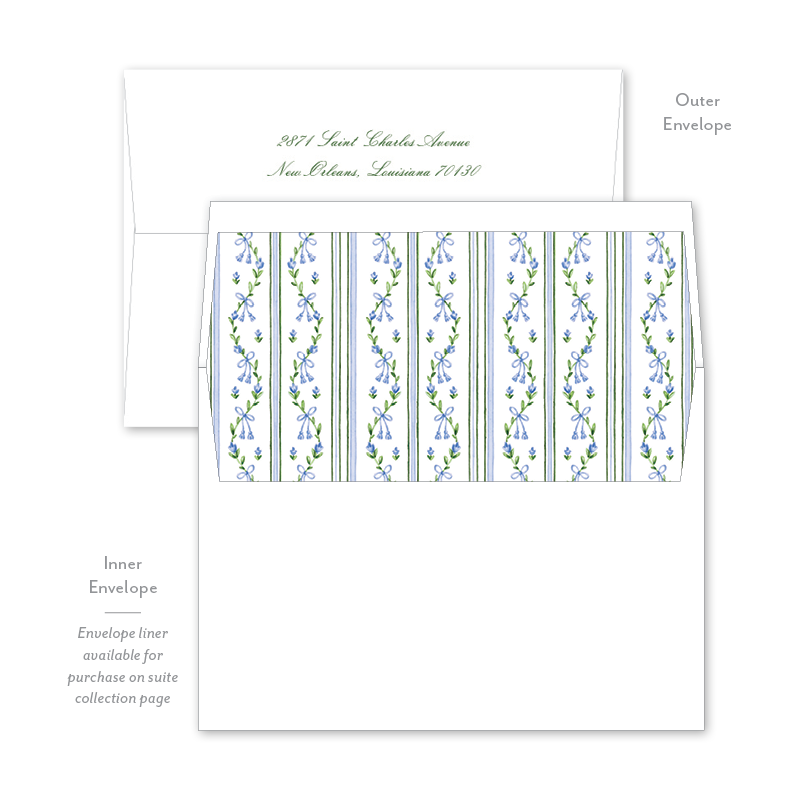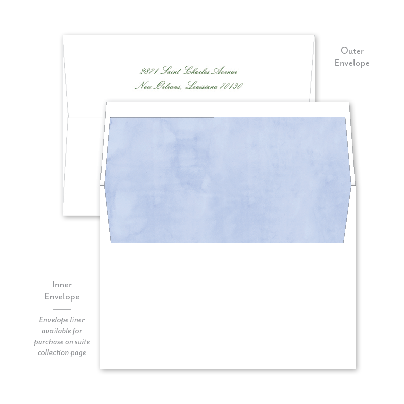 Each invitation comes with an inner and outer envelope and return address printing on the outer envelope flap.  Envelope liner may be purchased for an additional cost on the main collection page.