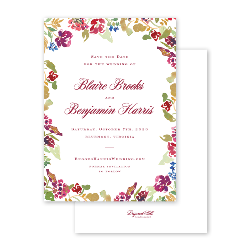 Select your order quantity from the dropdown menu below and check your total. Enter the text for your Save the Date in the “Note” box below. Click Add to Cart. Your wording does not have to match the sample product wording and can be customized for your Save the Date. You will receive a proof notification via email and text message within 3 to 5 business days.If your Save the Date includes a photo, please email a high resolution image along with your order number to weddings@dogwood-hill.com.