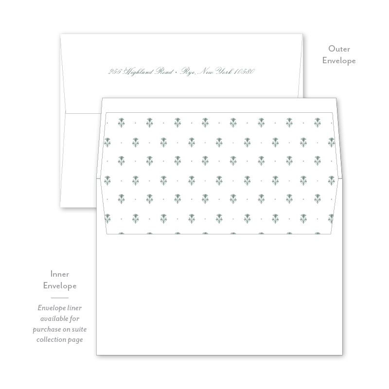 Each invitation comes with an inner and outer envelope and return address printing on the outer envelope flap. Envelope liner may be purchased for an additional cost on the main collection page.