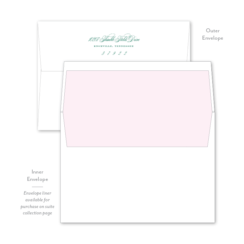 Each invitation comes with a blank inner and outer envelope and return address printing on the outer envelope flap. Envelope liner and recipient address printing for each envelope may be purchased for an additional cost on the main collection page.