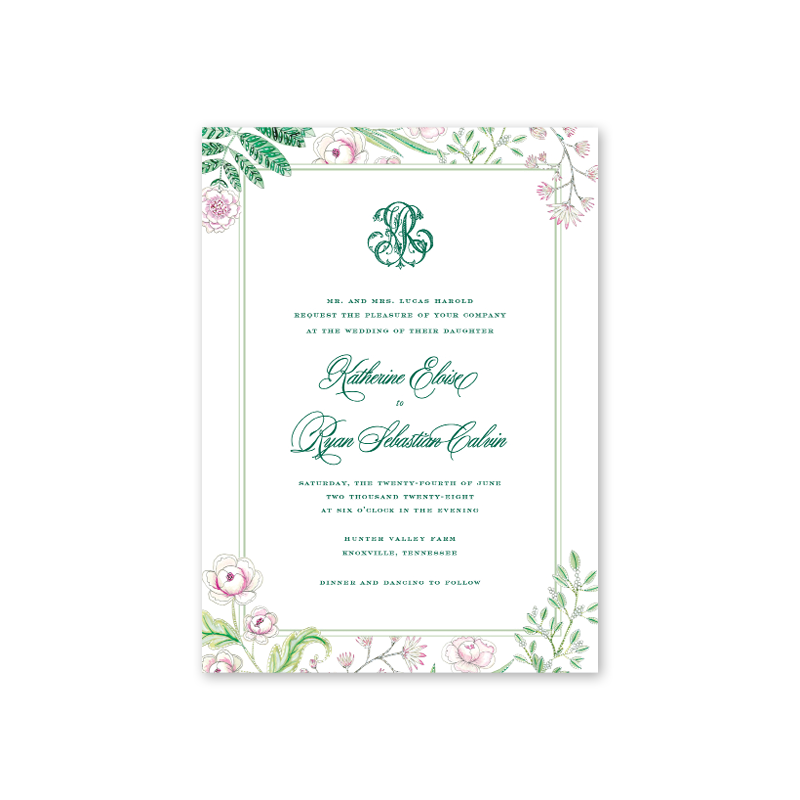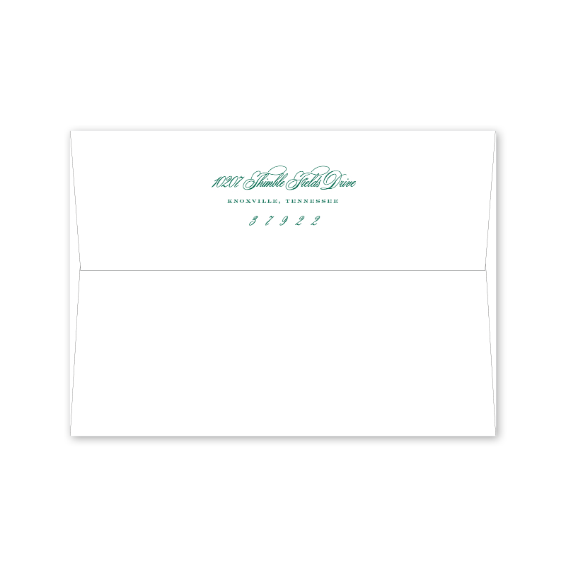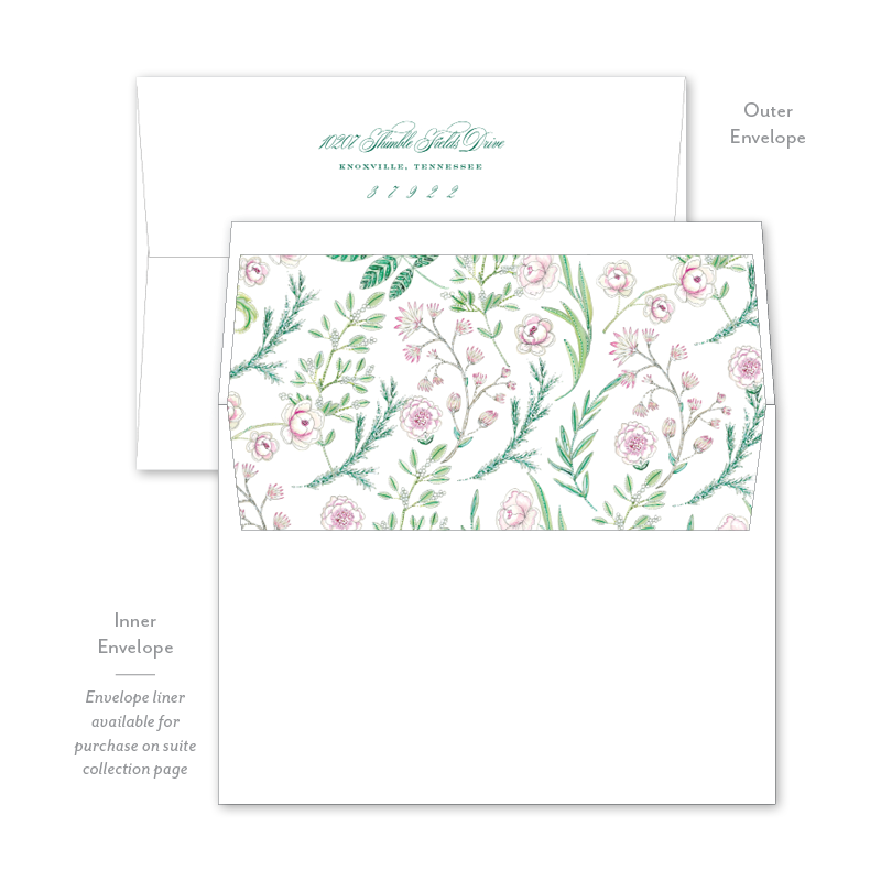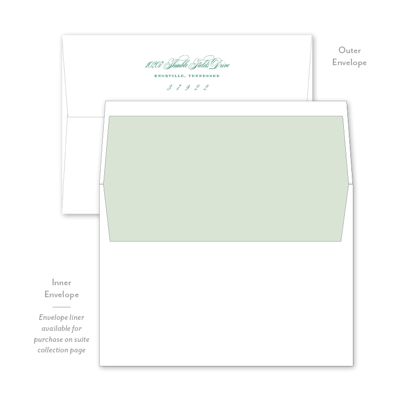 Each invitation comes with a blank inner and outer envelope and return address printing on the outer envelope flap. Envelope liner and recipient address printing for each envelope may be purchased for an additional cost on the main collection page.