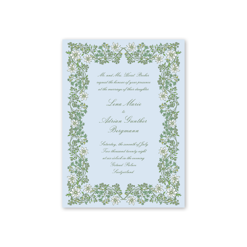 Each invitation comes with a blank inner and outer envelope and return address printing on the outer envelope flap. Envelope liner and recipient address printing for each envelope may be purchased for an additional cost on the main collection page.