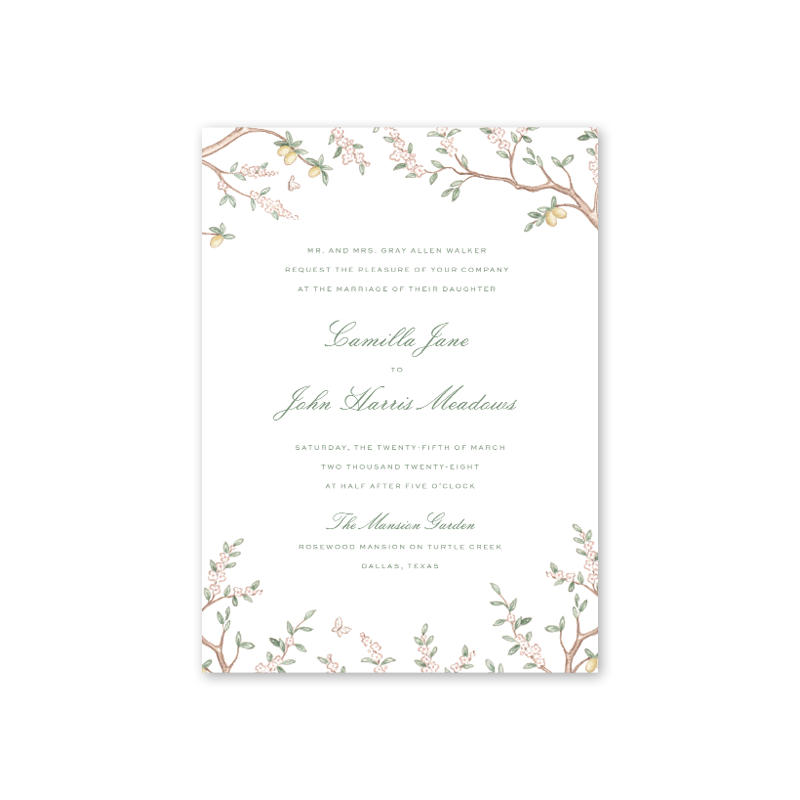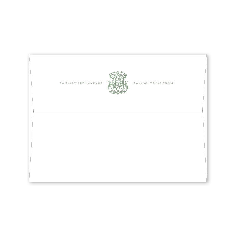 Each invitation comes with a blank inner and outer envelope and return address printing on the outer envelope flap. Envelope liner and recipient address printing for each envelope may be purchased for an additional cost on the main collection page.
