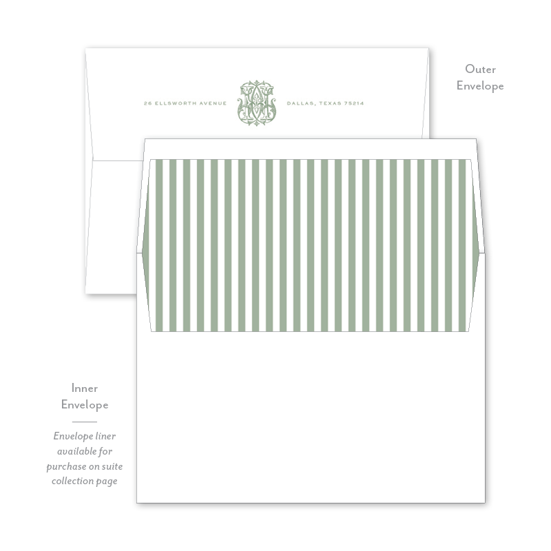 Each invitation comes with an inner and outer envelope and return address printing on the outer envelope flap. Envelope liner may be purchased for an additional cost on the main collection page.