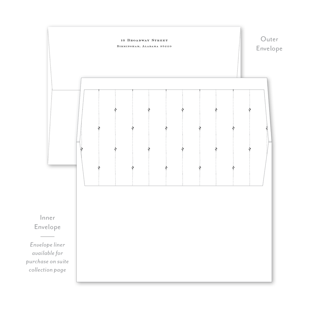 Each invitation comes with an inner and outer envelope and return address printing on the outer envelope flap. Envelope liner may be purchased for an additional cost on the main collection page.