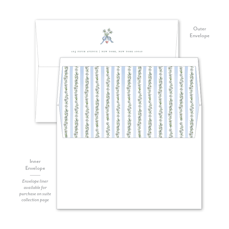 Each invitation comes with an inner and outer envelope and return address printing on the outer envelope flap. Envelope liner may be purchased for an additional cost on the main collection page.
